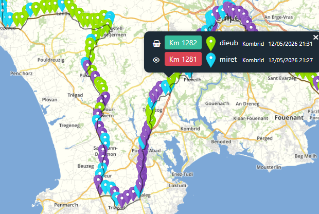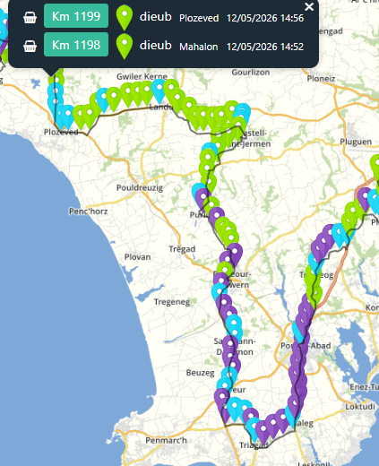 Parcours : Plozévet (14h56), Landudec, Plogastell Saint Germain, Peumerit, Ploneour Lanvern, Saint Jean Trolimon, Plomeur, Tréffiagat, Plobannalec, Pont-l'Abbé, Tréméoc et Combrit (21h31)